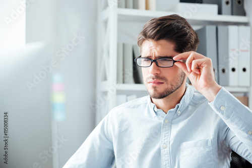 Close-up portrait of businessman in eyeglasses looking at monitor