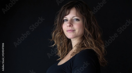 Close-up portrait of confident pregnant woman with wavy brown hair in black top against a dark background radiating beauty and strength during maternity