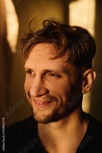 Close-up portrait of handsome young Caucasian man smiling against apartment background
