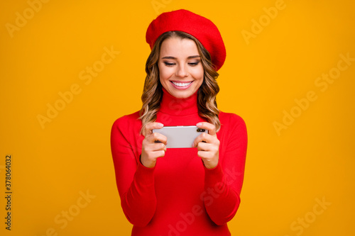 Close-up portrait of her she nice attractive lovely cheerful wavy-haired girl holding in hands cell playing network group strategic game isolated on bright vivid shine vibrant yellow color background