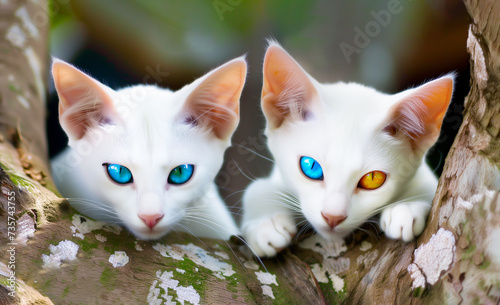 Closeup Portrait of Khao Manee White Cats, Kittens on Tree. Blue and Yellow Jewelry Eyes. Khao Plort, known as Diamond Eye Cat in Thailand. AI Generated. Horizontal Plane. National Cat Day.