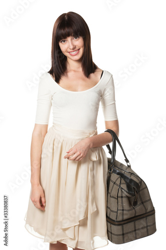 dress, woman, female, elegant, holiday maker, baggage, holding, baggage, traveler, suitcase, vacation, passenger, smiling, travel bag, pursed, bag, rest, trip, adult, young, leaves, travel, summer, pastel, people, person, pretty, leisure, tour tourism, journey, isolated, vertical, portrait, standing, elegance, brunette, departure, caucasian, lifestyle, beautiful, attractive, white background, cheerful, happy, happiness, handle, voyage, toothy
