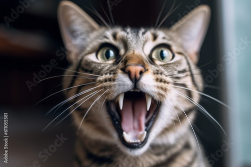 Close-up portrait photography of a curious egyptian mau cat yawning against a modern kitchen setting. With generative AI technology
