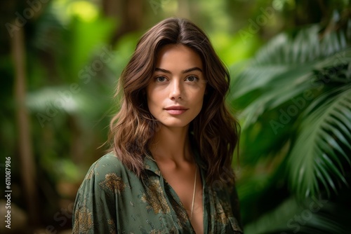 Close-up portrait photography of a glad girl in her 30s wearing a chic cardigan against a lush tropical jungle background. With generative AI technology