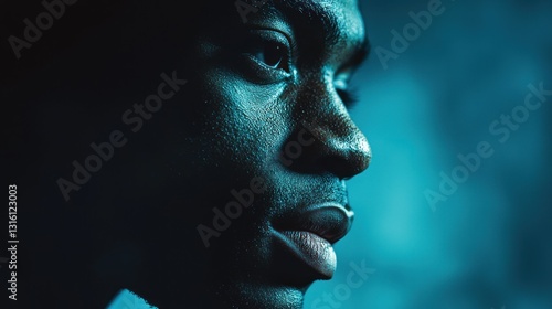 man, face, profile, portrait, closeup, serious, pensive, thoughtful, contemplative, intense, dark, shadow, light, blue, teal, skin, expression, emotion, feeling, mood, person, human, male, adult, young, photogenic, attractive, gaze, eye, nose, mouth, lip, head, shoulder, background, abstract, dramatic, mysterious, powerful, strong, hope, determination, resilience, sharpened, concentration