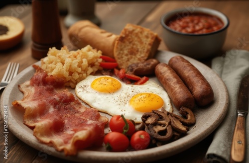 close-up shot of a beautifully arranged breakfast plate, featuring two sunny-side-up eggs with perfectly set whites and rich, golden yolks glistening under soft morning light
