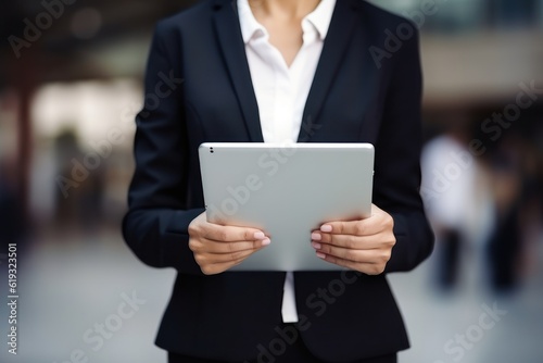Close-up shot of a confident businesswoman delivering a compelling corporate presentation using a tablet. The focus is on her hands and the tablet screen. Non-existent person. Generative Ai