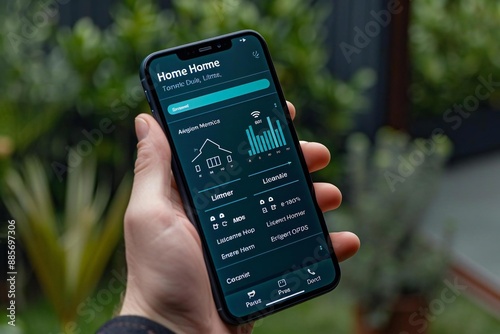 close-up shot of a hand holding a mobile phone with a home control system app on the screen, showcasing features like heating, alarm, security, lighting control, and energy management.