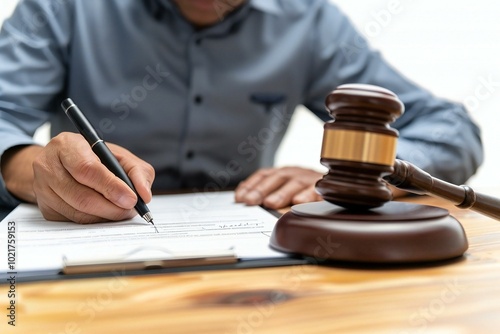 Close-up shot of a man signing a legal document at his desk in a courtroom, showcasing themes of justice and arbitration.