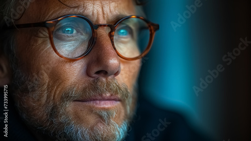 Close-up shot of a man wearing his Smart Glasses, stylish eyeglasses for man, light through eyeglasses, new technology, a mixed-reality, super close-up face