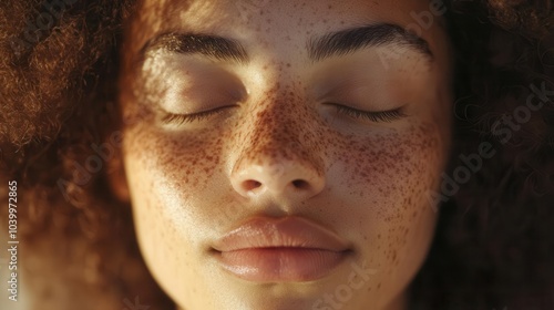 close-up shot of a mixed-race woman's freckled complexion, her eyes gently closed, showcasing natural beauty and uniqueness in soft, diffused lighting