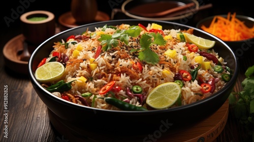 Closeup shot of a steaming hot serving of Thai fried rice in a traditional ceramic bowl, captured from above to show the rich colors and variety of ingredients The background features a dark wooden