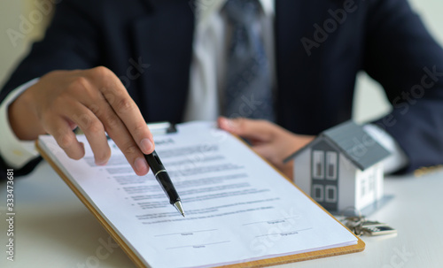 close-up shot of House broker pointing the pen on document signing the house purchase agreement.