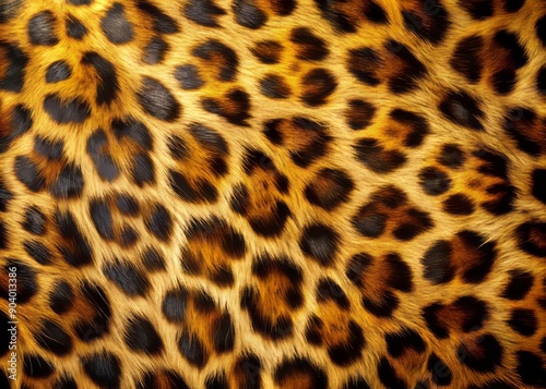 Close-up shot of luxurious leopard fur texture, showcasing vibrant golden spots on dark brown background, with soft, velvety pelt and intricate natural patterns.