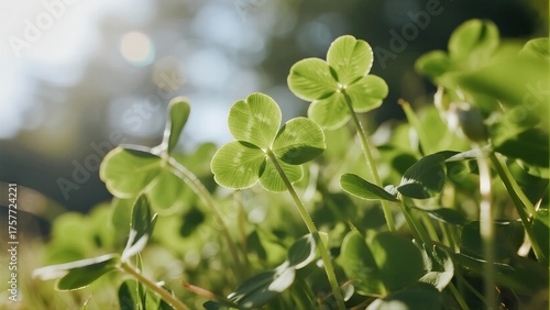 Close-up shot of vibrant green clover leaves illuminated by natural sunlight, showcasing their fresh and healthy appearance.