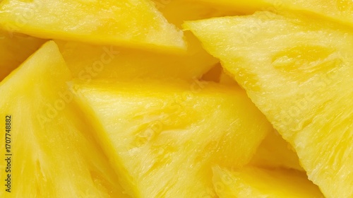 Closeup slices of ripe pineapple arranged as tropical fruit background with fresh juicy texture, vibrant yellow color and natural exotic pattern for healthy food and summer concept