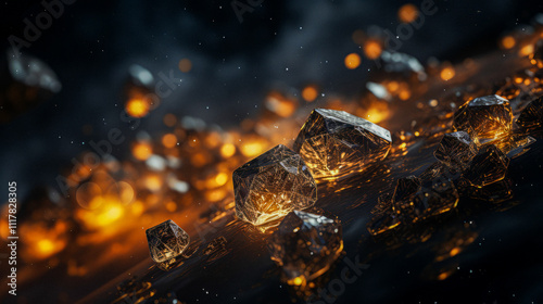 Close-up space trash and crystal debris floating in the vacuum. Polluted environment. Created with image generation tools