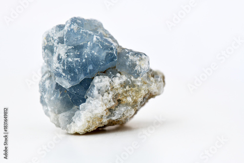Close-up studio shot of a raw, light blue Celestine (Celestite) mineral specimen with crystals embedded in tan and white rock matrix, isolated on a white background. This image is perfect for geology.