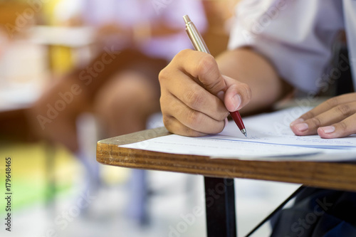 Closeup to hand of student holding pen and taking exam in classroom with stress for education test.Vintage style