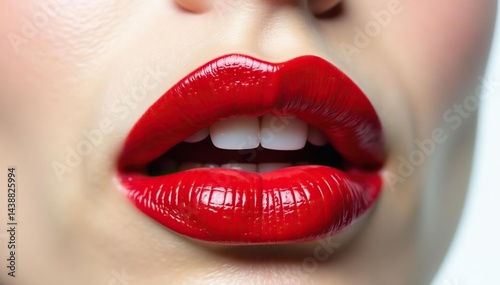 Close-up vibrant red lips, stark white backdrop, cosmetics, red lips