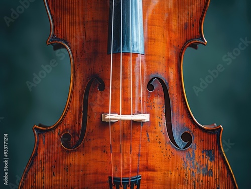 Close-up view of a beautifully crafted violin with intricate wood grain details and strings, showcasing fine craftsmanship and elegance of musical instruments