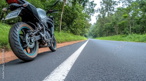 motorcycle, black, asphalt, road, green, tree, minimalist, wheel, headlamp, soft, shadow, natural, lighting, parked, solitude, vehicle, scenery, transportation, near, nature, summer, tranquil, street, casual attire, sporty, travel, adventure, freedom, environment, still, life, sleek, design, motorbike, peaceful, close, sharpened, trip, wandering, biking, cruising, relaxing, landscape, urban