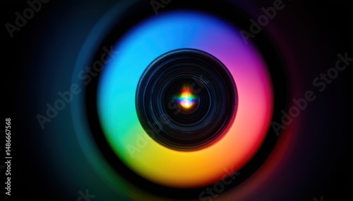 Close-up view of a camera lens surrounded by vibrant rainbow colors, creating a captivating and colorful image perfect for technology or photography related projects. : Generative AI