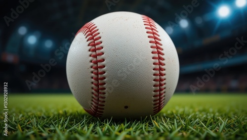 Close-Up View of a Classic Baseball on a Grassy Field Inside a Stadium Environment