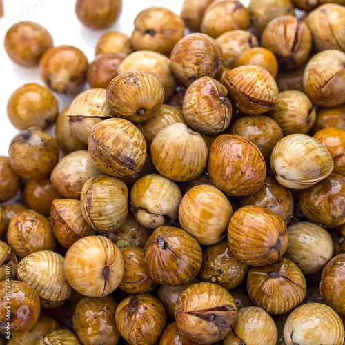 Close-up view of a cluster of roasted, glossy, light brown seeds, showcasing their intricate textures and patterns.
