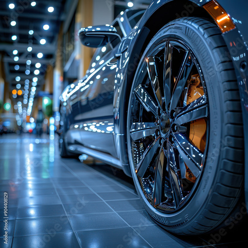 Close-up view of a futuristic sports car showcasing its sleek design and modern technology.