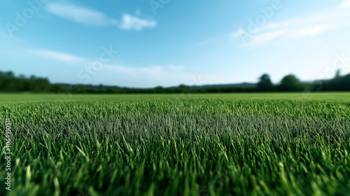 Close-up view of a lush green grassy field under a clear blue sky with distant blurred trees on the horizon