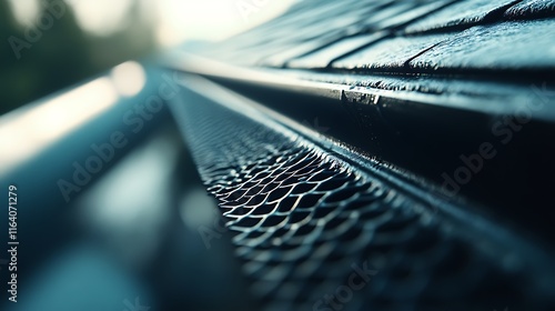 gutter, mesh, drainage, roof, water, home, house, system, protection, metal, grid, structure, detail, closeup, texture, design, architecture, building, exterior, hardware, installation, maintenance, property, residential, construction, engineering, material, component, grooved, prevention, flow, line, shadow, dark, blue, teal, perspective, angle, photo, image