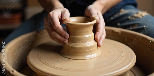 Close-up view of a potter's wheel in action, clay being shaped and molded into a beautiful form The spinning wheel and wet clay are beautifully highlighted , technique, texture