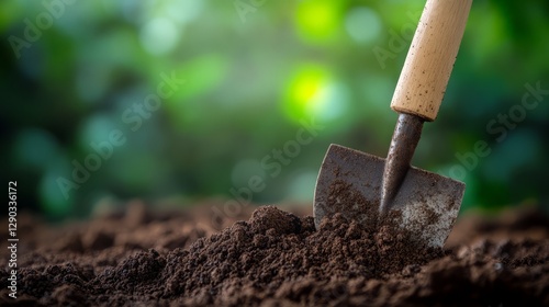 Close-Up View of a Shovel Digging into Fresh Garden Soil Under Natural Light