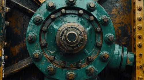 machinery, component, metal, rust-eaten, texture, detail, close, up, circular, gear, engine, part, industrial, equipment, wheel, hub, bolt, nut, rivet, screw, green, teal, yellow, gold, dark, grey, water, droplet, wet, grime, dirt, aged, vintage, mechanism, center, design, machine, weathered, metallic, textured, closeup, pattern