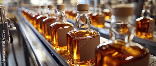 liqueur, alcohol, whiskey, bourbon, rum, cognac, brandy, wine, spirit, bottle, glass bottle, assembly line, conveyer belt, distillery, factory, manufacturing, industrial, amber, gold, brown, liquid, process, automated, machinery, equipment, beverage, label, closeup, detail, alcoholic beverage, drink, distilling, industry, cardboard box, contemporary, alcoholic, seasonal
