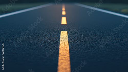 Close-up view of an empty asphalt road with yellow dashed lines, stretching into the horizon under a vibrant morning sky, symbolizing journey and adventure.