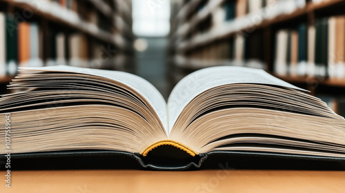 Close-up view of an open book with pages fanned out on a wooden table, blurred bookshelves in a library background