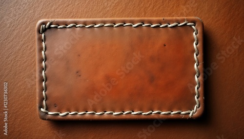 Closeup view of brown leather patch with stitched border. Natural leather texture. Stitching details. Craftmanship. High quality leather goods. Vintage style. Detailed close up image of stitched