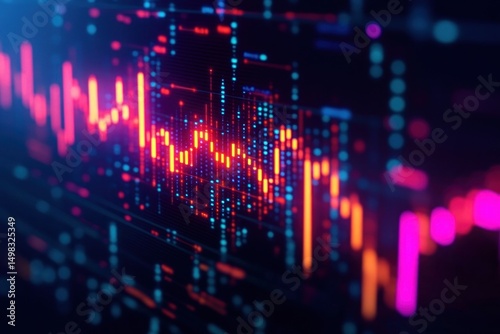 Close-up view of colorful digital candlestick chart representing fluctuating data on a dark background with neon highlights