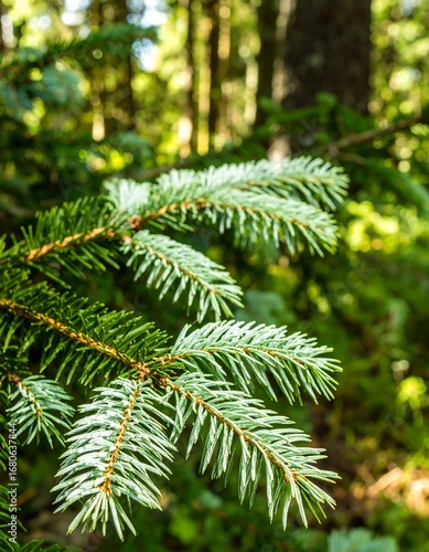 Close-up view of delicate evergreen needles against a blurred forest backdrop.