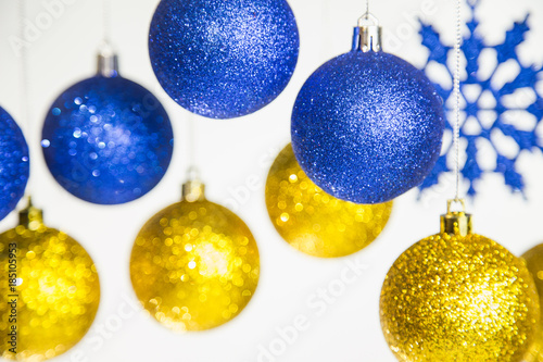 Closeup view of different Christmas ornaments isolated on white background. Colorful blue and golden shiny toys hanging on silver ropes. Horizontal color image.