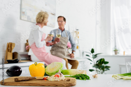 close-up view of fresh vegetables in wooden cutting board and senior couple drinking wine behind in kitchen