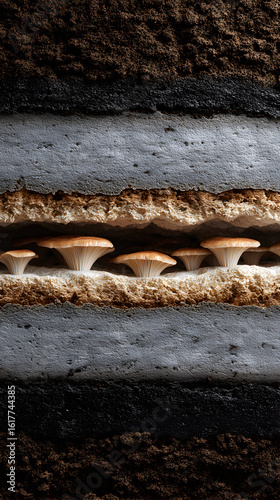 Close-up view of layered soil with mushrooms growing between dark and light textures, showcasing the beauty of nature's underground ecosystem and the importance of biodiversity
