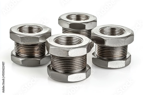 Close-up view of multiple threaded metal connectors.