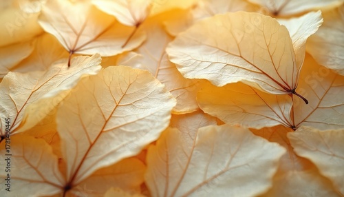 Close-up view of pale yellow autumn leaves with visible veins creating delicate natural texture. Soft golden light illuminates foliage, suggesting gentle fall season backdrop overlay. Perfect for