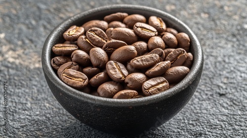 Close-up view of roasted coffee beans in a dark bowl. The beans have a rich texture and color, contrasting with the black surface.