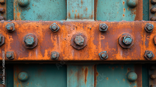 Close-up view of rusty metal surface with prominent bolts and corroded texture. Industrial decay and weathered steel evoke strength, time, and gritty mechanical design in an aged environment.