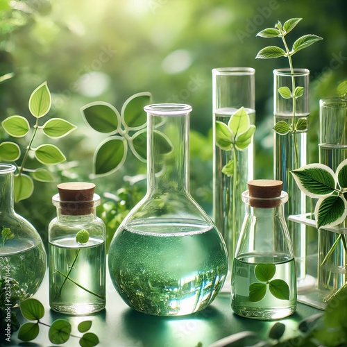 Close-up view of several glass laboratory vessels, including test tubes and an Erlenmeyer flask