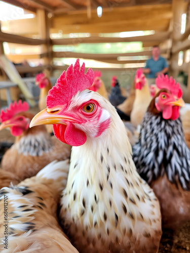 hen, chicken, farm, poultry, bird, red, brown, head, close, up, detail, farm animal, animal, agriculture, rural, nature, group, portrait, domestic, feather, beak, blood-red, orange, eye, composure, concentrated, focused, light, shadow, dark, background, barn, stable, caged, farmhouse, farming, domesticated, image, photo